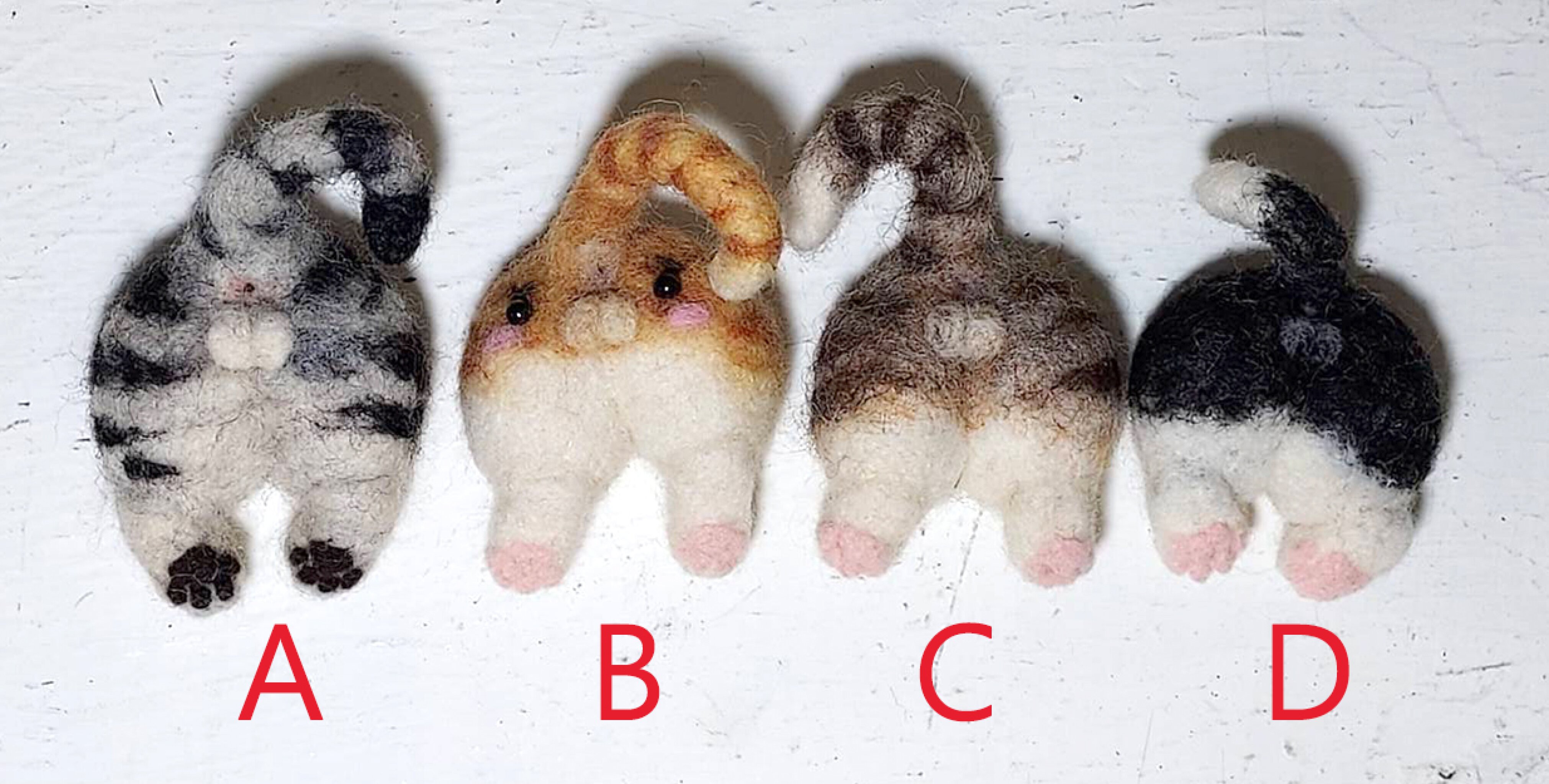 1.貓屁屁:A.灰虎班B.橘虎斑C.咖啡虎斑D.黑白E.客製花色