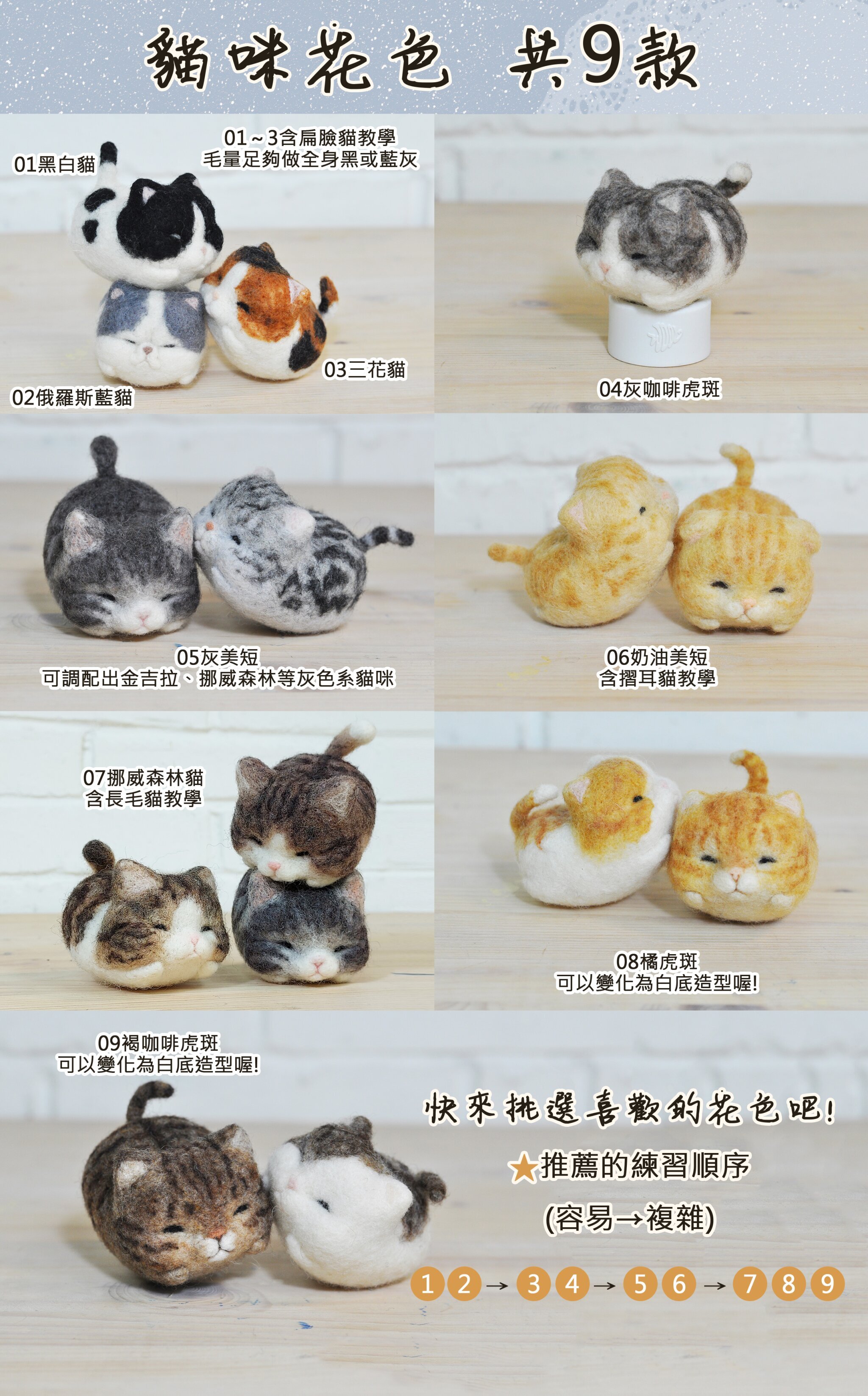 2.小中風貓:01黑白貓02俄羅斯藍貓03三花貓04灰咖啡虎斑05灰美短06奶油美短07挪威森林貓08橘虎斑09褐咖啡虎斑10客製花色