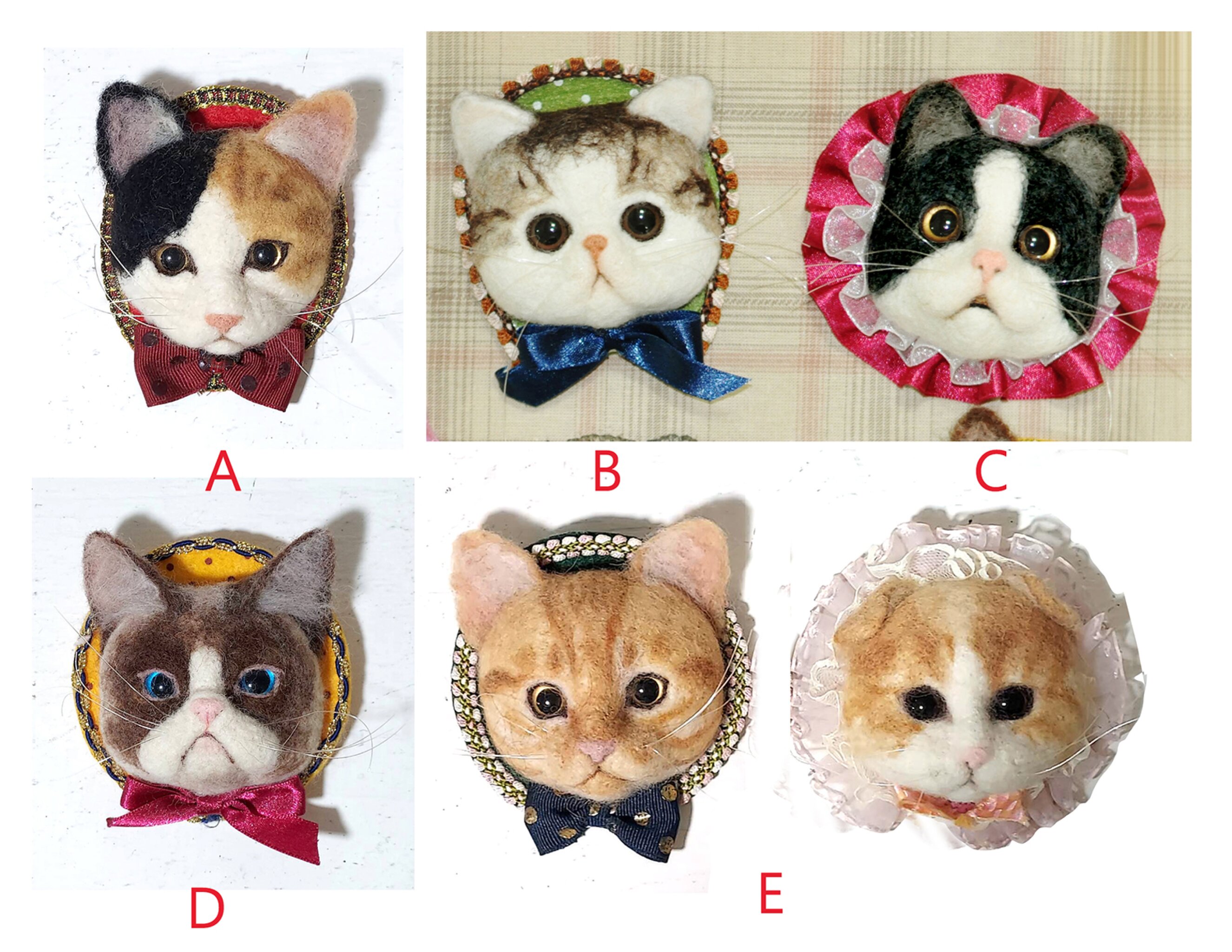 3.擬真貓咪頭像別針:A.三花貓B.咖啡虎斑C.黑白賓士(黑貓)D.暹羅臭臉貓E.橘虎斑F.客製花色